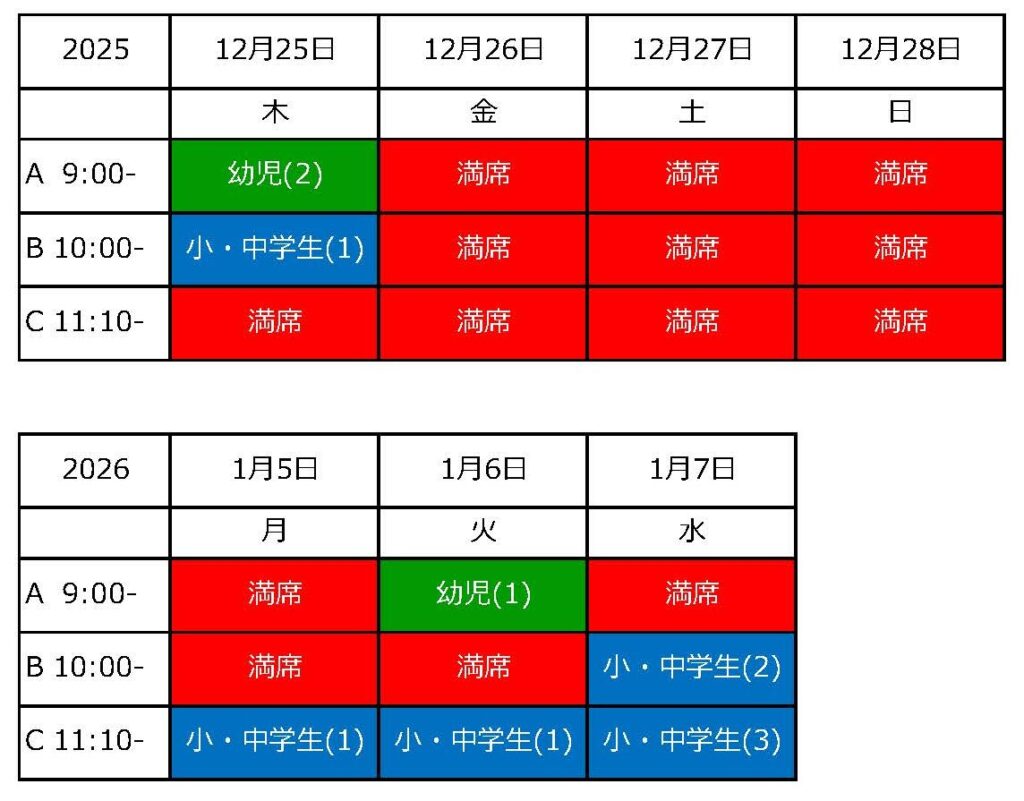 2025年のウィンターレッスンの予約状況です(2025年12月26日現在)