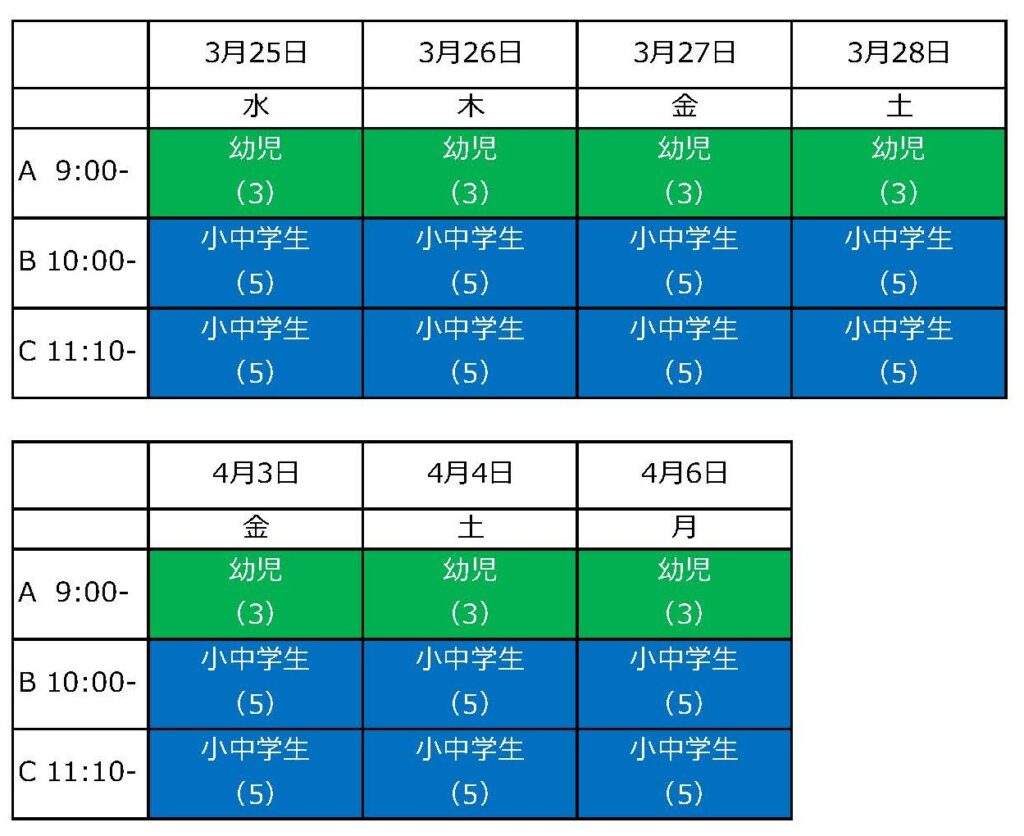 2025年のサマーレッスンの予約状況です(2024年7月30日現在) ※色のついていない枠は、幼児・小学生・中学生 どなたでも可能です。 ※()内は残席数です。 ※先着順ですので、ご予約が入っていて受 …