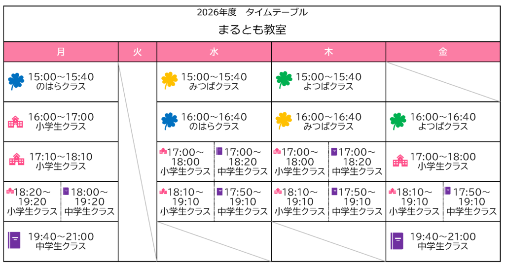 お知らせ 2026年度のタイムテーブル 投稿日:2026年3月31日 2026年度のまるとも教室の時間割が決定しました。 Twitter Facebook Google+ Pocket B!はてブ LINE -お知らせ 執筆者:marutomo